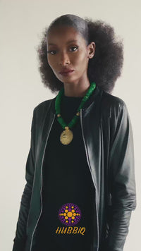 Indulge in African-inspired luxury with our Adinkra Jewelry Set, handcrafted with rare sparkling green Ashanti beads and exquisite brass metal accents. This breathtaking jewelry set is extraordinary in beauty and opulence, it comes replete with one necklace and two bracelets. The one-of-a-kind design also adds a touch of modernity and craftsmanship, the perfect accessory for a refined and elegant style.