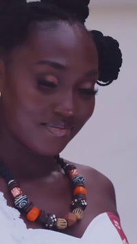 The Grusi necklace is a unique, handcrafted jewelry piece with its quirky, yet bold mix of eye-catching beads. Designed with predominantly neutral tones to work well with a wide range of outfits, its fun pops of orange and African-inspired patterns add a different cool that flatters your style. Make a gorgeous splash in this statement beaded necklace for a refined and sophisticated African-inspired elegance.