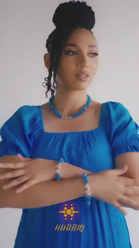 Indulge in elegance with the rich blue sparkly Sika Jewelry Set. "Sika" is a Twi word which means money or wealth. This vibrantly stylish set includes two bracelets and two necklaces, perfect for modern and sophisticated looks. Add a touch of luxury to any outfit with the Sika Jewelry Set.